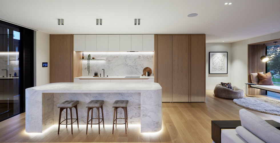 Island curves have been used to create flow around the open plan living area while adding a soft, organic influence into the home. Natural stone (3 x consecutive slabs) with a reasonably consistent pattern was needed to achieve this look. The original selection of 20mm thick Matarazzo arriving damaged after being leathered with limited time/supply due to COVID. Luckily, we were able to source 30mm Matarazzo stone already in a leathered finish – totally different look to the original selection - Extra floor joists were added below the island (approx. island weight 1000kg)
